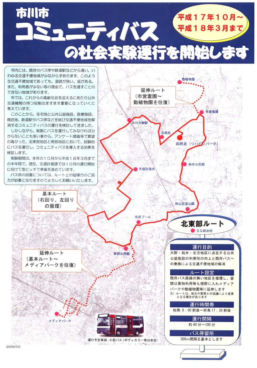 市川市は、2005年10月から2006年3月まで、市内を巡回するコミュニティバスの社会実験運行を行なう予定です。運行ルートは、市北東部(大野・柏井・北方周辺)と市南部(妙典・行徳・南行徳周辺)のふたつ。南部ルートは、妙典駅から浦安市川市民病院(浦安・当代島3丁目)をむすんで行徳地区を縦断し、いちぶはメディアパーク市川(鬼高1丁目)まで延伸される計画です。